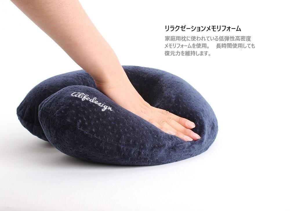 低反発(メモリフォーム)のネックピロー。携帯性に便利なコンパクト収納ポーチ付き。